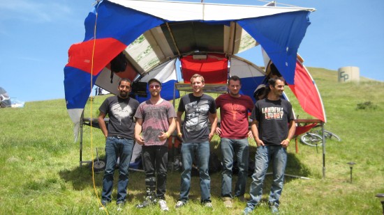 Being set on a hill, this team’s structure catches the eye because of its canopy, which is made of a brightly colored reclaimed sail. This structure carried a Hollywood theme; as it caught the eye, it was meant to be the center of the village. Solar panels are used to power a movie projector. The movie can be projected onto the opposite side or the sail, or on to a hard surface screen that can be folded down to double as a table.